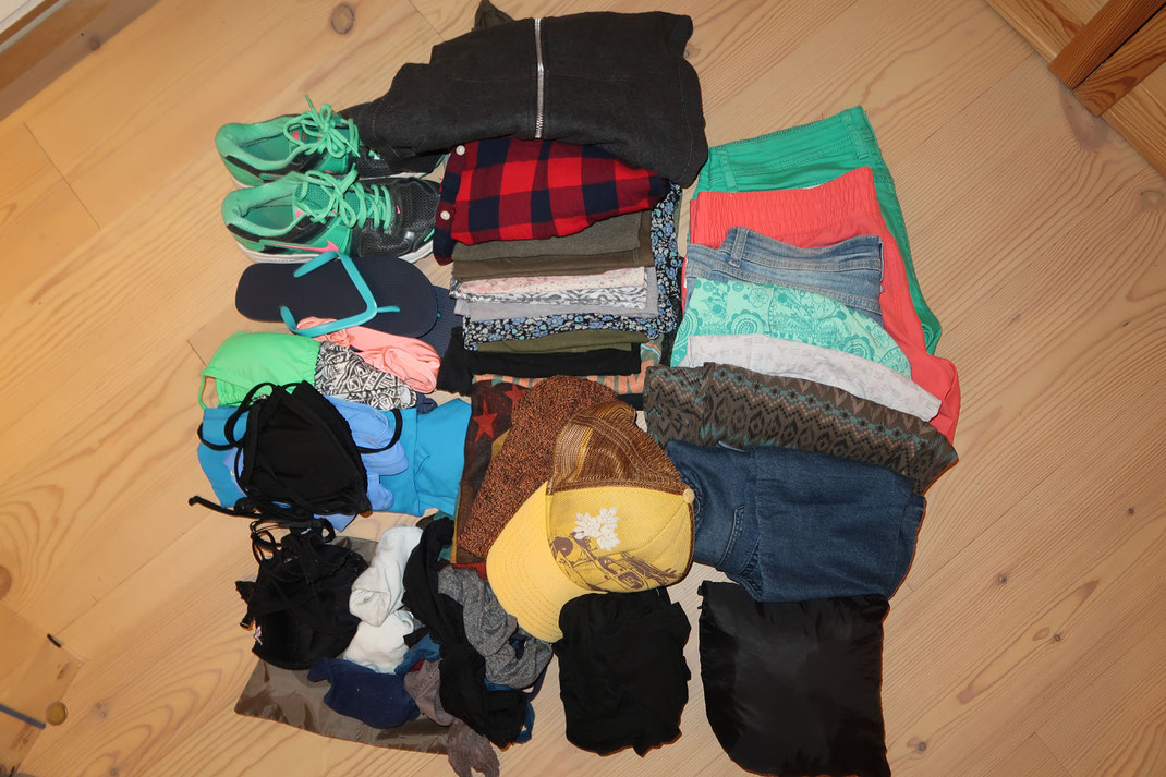 Auf all meinen Reisen nehme ich das Gleiche mit. Denn es ist egal, ob du eine Woche, ein Monat oder ein Jahr unterwegs bist. Du brauchst das Gleiche. Schließlich gibt es überall Waschmaschinen oder Wasser, wo man seine Wäsche mal schnell selbst durchwaschen kann.